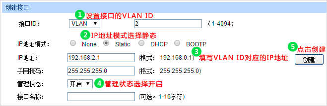 填写VLAN ID及IP地址等参数,并点击“创建”,便可以添加其他VLAN的IP来管理三层交换机。如下图: