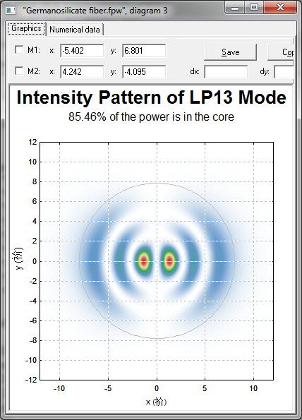 该程序是用于计算光纤模式特性较为复杂的案例。采用掺锗的多模光纤,一定锗浓度下超高斯横向分布。纤芯折射率位于硅与锗之间,取决于锗含量。硅与锗的折射率可由Sellmeier定理计算,与波长有关,需要进行色散计算。模式求解方法(2.5节)提供了相关函数,可计算所有模式的有效折射率、群折射率、群速度色散等。