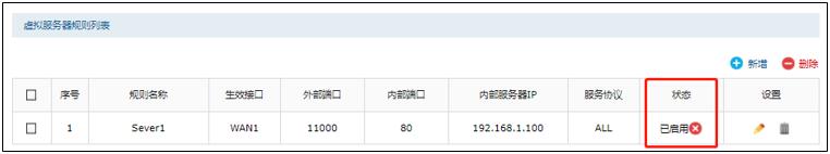 解决办法:确认规则中的<内部端口>是服务器的真实端口,<内部服务器IP>是服务器的IP地址,且对应规则<状态>为“已启用”。