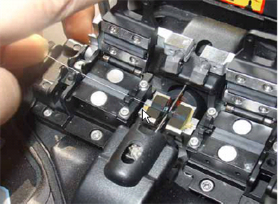 步骤23:将斩好的尾纤放到光纤熔接机的另一侧(两光纤尽量对齐)