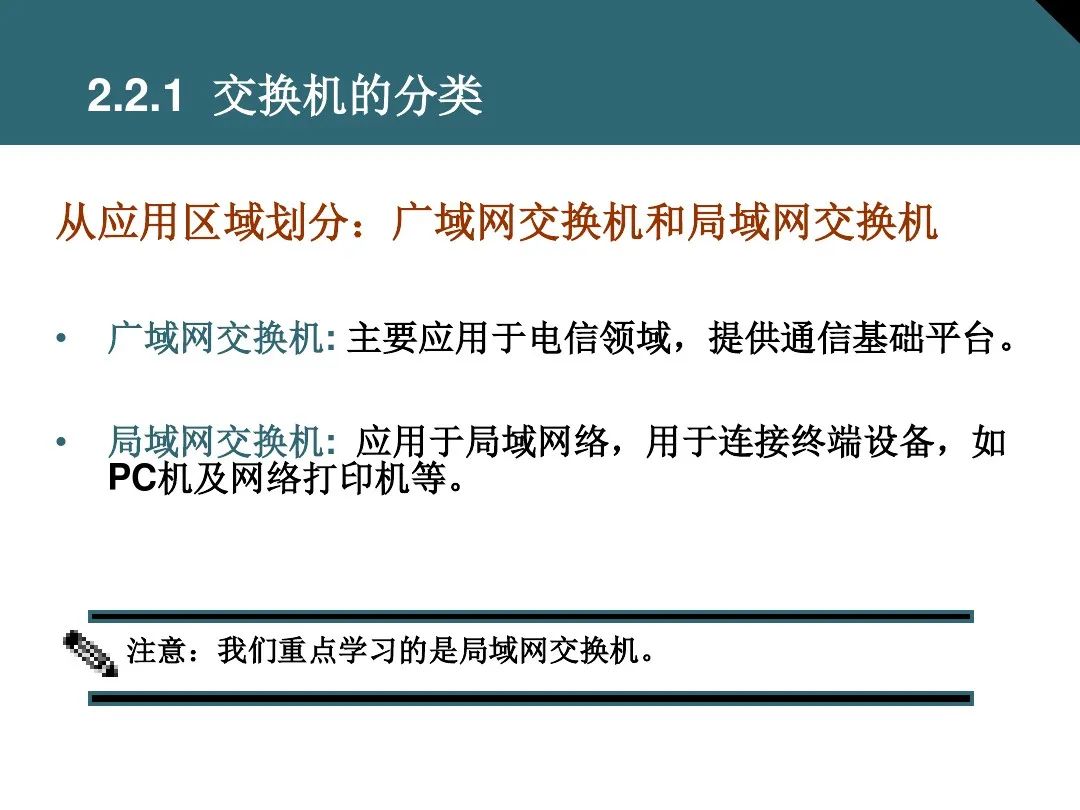 交换机基础知识详解,内容包括交换机概述、交换机的分类和性能指标、交换机的接口和链接方式、虚拟局域网和多层交换、交换机产品介绍等内容。