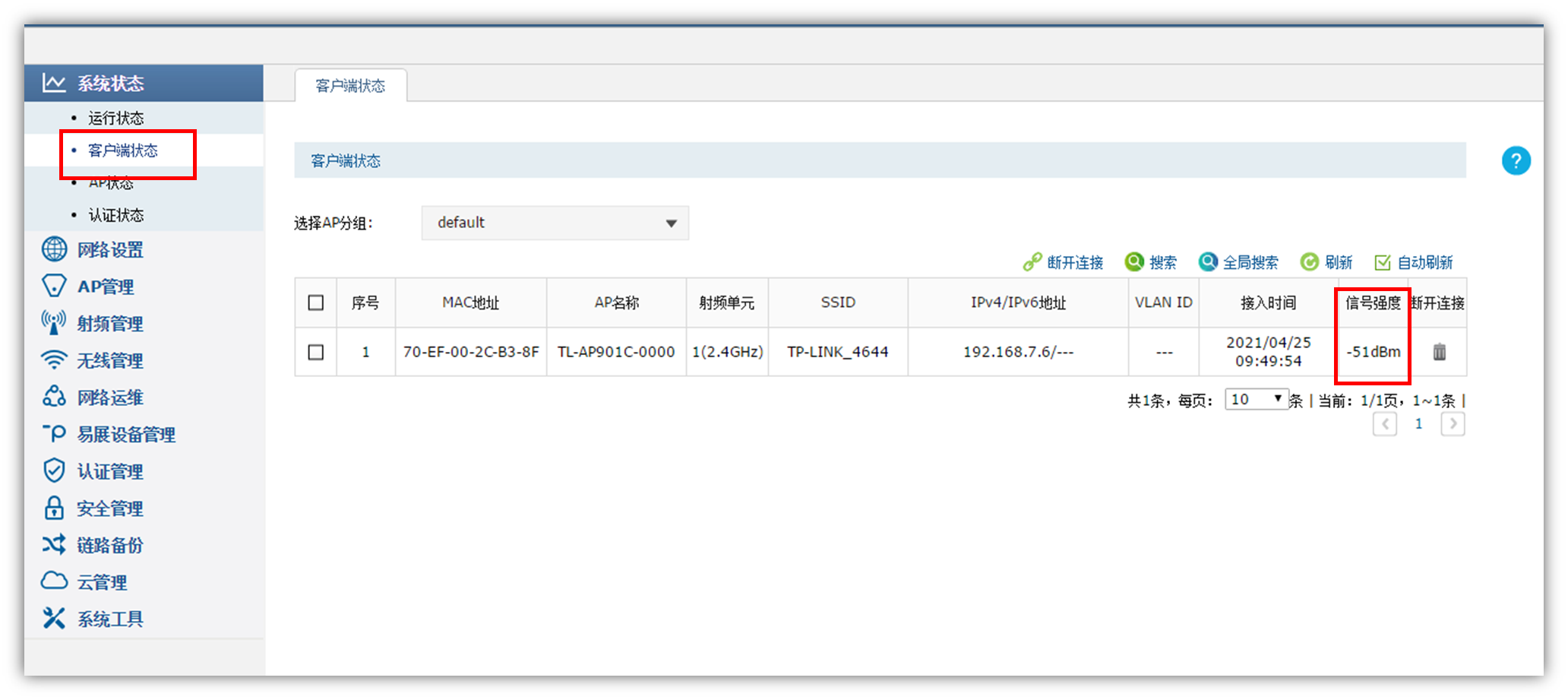 然后,检查无线参数。首先,检查无线信号强度,保持信号强度大于-70db。安卓手机可以下载网络百宝箱查看无线信号强度,苹果终端或无线PC可以通过路由器中的无线客户端状态查看无线信号强度。其次,检查无线协商速率,确保无线终端与AP协商至最大无线协商速率。
