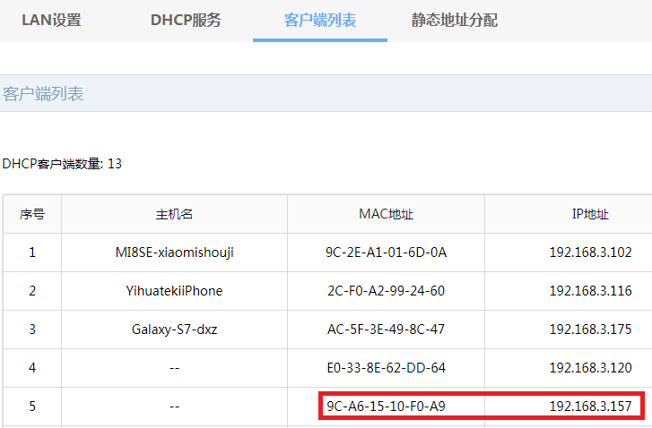 再通过路由器管理界面的DHCP客户端列表查找离线AP的对应MAC地址。