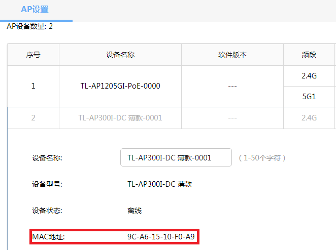 由于线路故障导致AP和路由器之间无法通信的情况也不在少数,可以通过路由器管理界面中的AP管理>>AP设置确认当前离线AP的MAC地址。